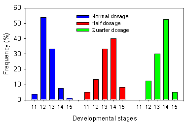 Fig. 2.1. The higher biomass of Atriplex patula at quarter and half dosages than at normal dosage was significant from second collection already. Only at second collection in late June, plant dry weight of Bilderdykia convolvulus showed an effect of dosage. Plants at quarter dosage had a significantly higher biomass than at half dosage (Tukey-Kramer test, p=0.005) and the plants at half dosage had a significantly higher biomass than plants at normal dosage (Tukey-Kramer test, p=0.001). At third collection in late July a significant effect of pesticide dosage was observed for dry biomass of Aethusa cynapium, mean dry biomass was higher at quarter dosage than at normal dosage (Tukey-Kramer test, p=0.002). Biomass of Viola arvensis in spring barley Very few Viola arvensis plants survived spraying with normal herbicide dosage in spring barley, not enough for statistical analyses, thus no observations on biomass and developmental stages were performed in the spring barley plot receiving normal dosage. Immediately before harvest of spring barley in August, significantly smaller V. arvensis plants (mean 13 mg) were found in the plot receiving half dosage in comparison with plants in the plot receiving quarter dosage (mean 23 mg) (t-test, p=0.002). No difference, however, was observed at any other time of collection. Phenology of Aethusa cynapium Five weeks after spraying, A. cynapium showed a significant difference in developmental stages at different herbicide dosages in the sugar beet field (Kruskal-Wallis test, p<0.001). Plants treated with quarter dosage were significantly more developed than plants treated with normal dosage (Fig. 2.2). This pattern was found at the first three collection days, while at last collection the differences in developmental stages among dosages were no longer significant (Kruskal-Wallis test, p=0.08).