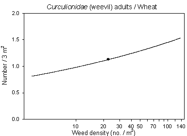 The arthropod populations selected for the combined analyses were all true herbivores : 1. Chrysomelidae. 2. Curculionidae. 3. Miridae. 4. Auchenorrhyncha. 5. Lepidoptera and 6. Symphyta. Many species of these groups are known to feed on both broad-leaved weed and on wild and cultivated grasses, and superior analyses were therefore carried out on the population sizes in relation to the general covariates describing the weed community: weed density and weed diversity. The highest number of significant correlations between populations of abundant arthropod groups and the two covariates describing the weed community were found in barley (Table 6.3). Significant positive correlations were here found for five of the six families/orders of arthropods analysed either for adult or juvenile stages (a total of nine groups). Negative correlation, however, was found for one of the nine groups. That was for adult Auchenorrhyncha (cicada) (p=0.0194*) in relation to weed diversity. There is no immediate explanation for that contrary result, but since it is only one of 18 analyses, it may have happened by coincidence. An example on a positive correlation between an important bird food item Symphyta (sawfly) larvae and weed density is illustrated in Fig. 6.1. This and the following figures should not be interpreted too strictly; they are just models and do not show the often sizable variation between farms, years etc. demonstrated in the study.