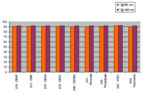 Fig. 7 6.2.6 Light transmission determined on roll milled film specimensTest method: USP XXIV <661> with the exception for the washing and drying of the film samples and with a wider range for the light transmission measurements (290 nm to 800 nm). Instrument model: Perkin Elmer LAMBDA 18; data interval: 1.0000 nm; scan speed: 240.00 nm/min; slit width: 2.0000 nm; smooth bandwidth: 0.00 nm. The single light transmission graphs are enclosed in appendix 7. Table 10