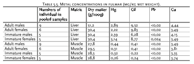 Table 5.5. Metal concentrations in fulmar (mg/kg wet weight).