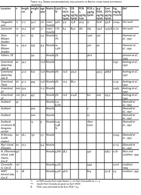A survey of the Arctic char caught in Heygardalsvatn and Leynavatn is shown in table 12.1. Pooled samples of female and male fish from Heygardalsvatn and Leynavatn were analysed for mercury in muscle tissue and organochlorines in liver samples. In total, the mean concentration of PCB 7 corresponds to 30 mg/kg liver, cf table 12.2. The congeners CB 153 and CB 138 constitute a total of 65% (64% and 66% in the pooled sample with female and male fish, respectively) in the fish from Leynavatn and 54% in the fish from Heygardalsvatn (exactly the same percentage in the three pooled samples).