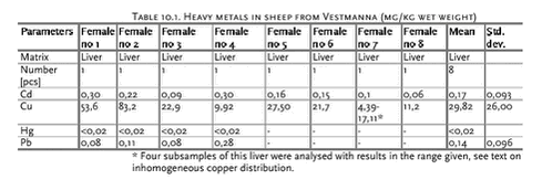 The heavy metal contents of the livers from Koltur and of the sheep muscles from Vestmanna and Koltur are given in tables 10.3 and 10.4.