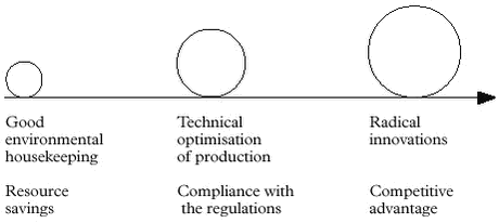 The above figure should not be misinterpreted as normative – that it is best that enterprises begin with good environmental housekeeping and then start the snowball effect. This is, of course, the most manageable progression from an organisational viewpoint. But there are example of movement in the opposite direction, such as Novotex in the textile industry, where a new product – in this case Green Cotton – gradually led to the introduction of cleaner technologies. However the figure does indicate that there is a difference in how radical the production changes are, and that different incentive structures must be expected to lie behind the different initiatives.