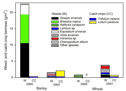 The highest weed biomass found was 23 g/m2 compared to 34 g/m2 in old organic cereal fields in Denmark (Hald 1999) and 47 g/m2 found in organic spring cereal fields in Finland (Salonen et al.