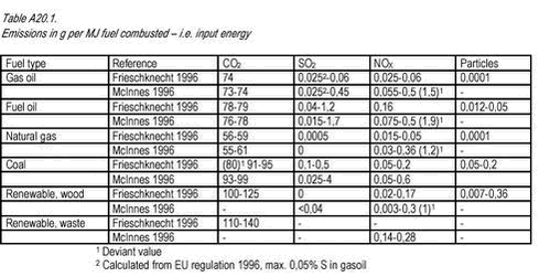 Table A20.1 below provides emission ranges from different types of fuels. The low value of some of the ranges implies emission control by technical precautions (except for SO2 of gas oil and for waste). Even lower values may occur depending on the efficiency of control technology, as given above.