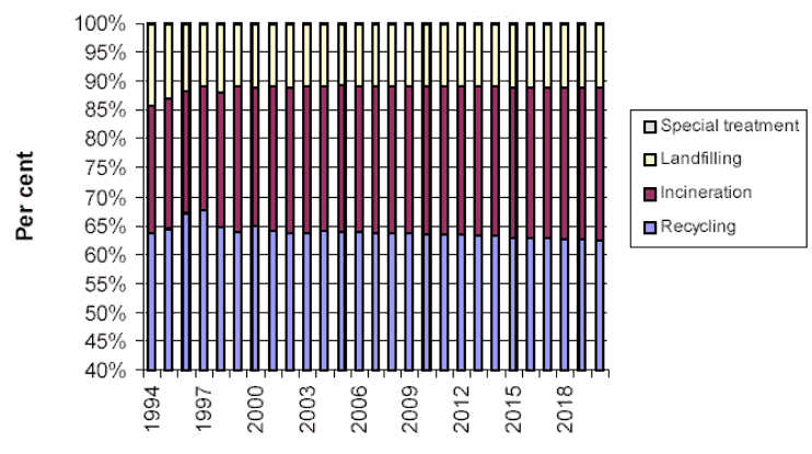 Figure 28. Trends in percentage distribution of waste by treatment option. Base scenario.
