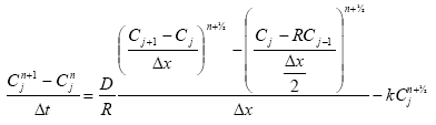 where C is concentration, D is diffusion coefficient (in this case D/R, R = retention coefficient), k is decay coefficient (also in this case k/R), x and t are distance (depth) and time. Discretising this equation: