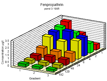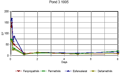 Concentration of pyrethroids in surface microlayer 1 hour to 8 days after spraying. Pond 3 1995