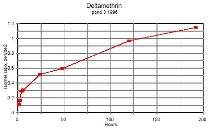 Time dependent ratio of the two deltamethrin isomers in pond water.