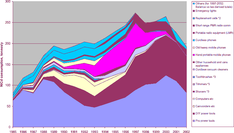 Figure 0-2: (Overleaf) Overview of the consumption of NiCd batteries over time and uses; mean values in tonnes/y.