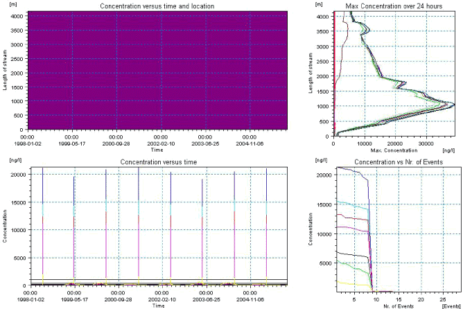 Figure 4.11. Example of result presentation overview by the PestSurf template for bentazon in the sandy catchment. The lowest detection concentration was set to 100 ng/l.