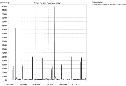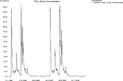 All maximum concentrations in the main stream are caused by wind drift events. Figure 10.15 and Figure 10.16 show the concentration pattern as it appears for the whole stream. Apart from the drift contribution, a high concentration is reached due to the extreme event in September 1998 (and 1994).