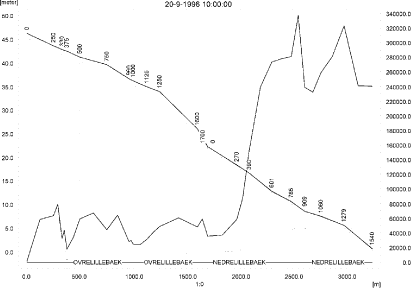 b) Figure 11.16. Concentration pattern for terbutylazin in the lower end of the sandy loam catchment, at calculation point NedreLillebaek 495.5 and 1279. Longitudinal concentration profiles of the sandy loam catchment are shown in Figure 11.17 and Figure 11.18 for 18 September 1998 and 26 October 2001, respectively. Figure 11.19 shows the pattern for a drift contribution, just after spraying and 3.5 hours later. The thin black line represents the concentration, while the thick black line shows the maximum concentrations obtained during the simulations. In addition, the outline of the stream is shown.