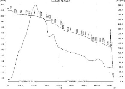 Figure 12.16. Concentrations in the the main stream of the sandy loam catchment on 31. March 2000, 8.30. The concentrations are generated by drift.