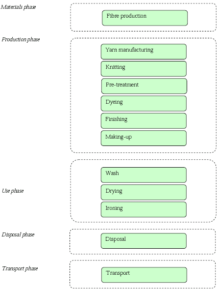 In the following, all phases of the T-shirt's lifecycle will be described from extraction of raw materials through production to the making-up of the finished T-shirt.