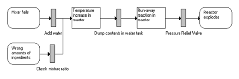 2.1.2 Recommendations in Environment Project 112 for qualitative acceptance criteriaEnvironment Project 112 defines qualitative acceptance criteria as criteria ensuring the safety measures in place are reasonable in proportion to the risk of accident. A consequence analysis is essential when using quantitative methods in order to quantify in detail how the accident impacts the surrounding area. However, when using qualitative methods, a consequence analysis is used to qualify these accidents in terms of their potential to impact the surrounding area – i.e. to qualify the seriousness of a given accident. Depending on the seriousness and expected frequency, requirements may be specified regarding the number and quality (failure rate and effectiveness) of safety measures. Environment Project 112 recommends barrier diagrams[9] as a tool to help present the results of risk analysis. These diagrams show the possible sequences of events prior to an accident, and the safety measures (hereafter referred to as barriers or safety barriers) that can prevent or mitigate the accident. Figure 6. Example safety-barrier diagram