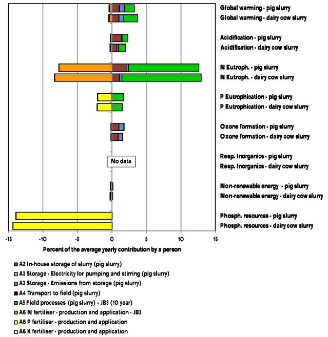 Figure 3.5. Normalised contributions to environmental impacts from the reference scenario for pig slurry and dairy cow slurry. soil type “JB3” and 10 years time horizon for global warming and for aquatic eutrophication (N).