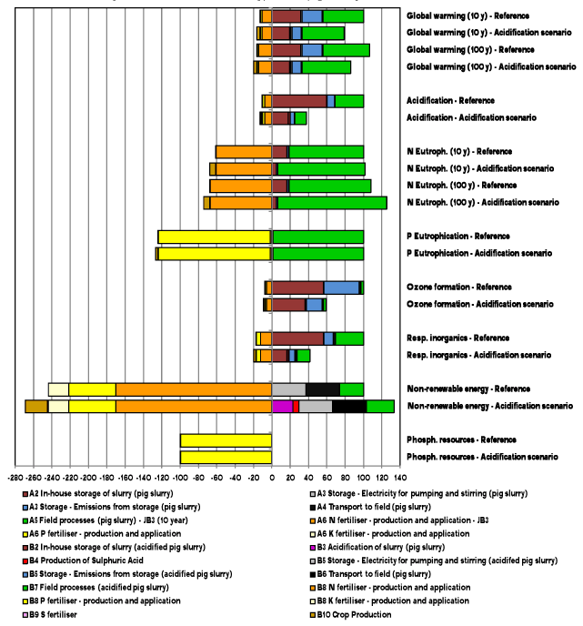 Figure 4.2. Environmental impacts for the system with acidification of slurry in an infarm NH4+ plant compared to the reference system (both based on soil type JB3) – pig slurry.