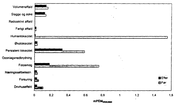 Figur 20 Vægtede miljøeffektpotentialerfor overfladebehandling med UV-hærdende lak i stedet for syrehærdende lak.