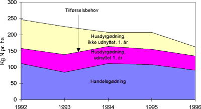 husdyrgødning. I 1992 var tilførslen i total-kvælstof på 135 kg. I 1996 er tilførslen