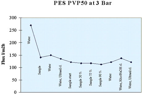 Kommentarer til grafisk afbildning af fluxmålinger Graferne fremstiller samtlige målte fluxer for alle tre membrantyper. Fra venstre mod højre ses initialflux, flux bestemt ved screeningsforsøget, vandflux efter screeningsforsøget og vandflux efter Ultrasil-rensning. Derefter følger koncentreringsforløbet og vandfluxen målt før hhv. efter to forskellige renseprocedurer. Bemærk: Bortset fra opkoncentreringsforsøget er fluxmålingerne udført som separate forsøg adskilt af nedlukning, skylning, opstart osv. Spredningen på målingerne kan derfor være større end indenfor en sammenhængende serie. Konklusion: Screeningen af tre typer ultrafiltreringsmembraner til koncentrering af fotospildevand med udfældet sølvkompleks viser at en UF-membran af regenereret celluloseacetat (RC) med MW cut-off 70.000 har tilfredsstillende og relativt konstant flux, ca. 100 l/m2h ved lavt tryk, ca. 4 Bar, mens polysulfon (PS) og polyethersulfontyperne (PES) får væsentligt nedsat (omend stadig høj) flux efter eksponering for prøven. Det var muligt at opkoncentrere prøven 10 gange ved lavt tryk, under 3 Bar, 22oC og gennemsnitsflux ca. 100 l/m2h. Fluxen for RC-membranen falder svagt ved koncentrering af prøven, men kan genskabes ved rensning med 1 % Ultrasil, hvorved næsten initiel kapacitet opnås. Eventuelle foulingsproblemer ved lang tids brug kan ikke forudsiges ud fra de udførte målinger, men synlig fouling for især PS- pg PES-typerne antyder at der kan opstå problemer. Dette kan afklares ved f.eks. 3 mdrs kørsel med et pilotanlæg.