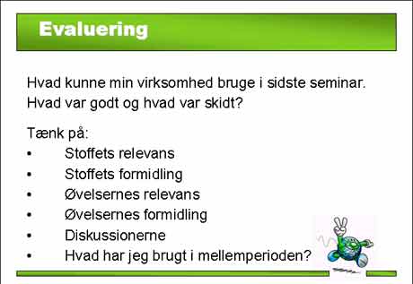 2 Evaluering, seminar 2 Hvad kunne min virksomhed bruge i sidste seminar. Hvad var godt og hvad var skidt? Der var en generelt tilfredshed med seminar 2. Dog har flere anført, at opgaverne var for lange og der var fejl i dem. Opgaven fra seminar 2 vil derfor snarest blive udsendt i redigeret udgave til deltagerne (opgave + løsningsforslag). 3 Kortlægning og vurdering af arbejdsmiljø Morten Walsted og Niels Erik Jensen redegjorde for arbejdsmiljø. Herunder: