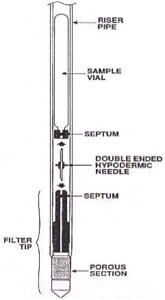 Fig. 11. Filtertip prøvetager (ASTM, 1992). Fordele og ulemper En ulempe ved filtertip prøvetageren har tidligere været den begrænsede vandmængde, som kunne udtages (glasampuller op til 200 ml), men i systemer som er tilgængelige på markedet findes nu glasampuller på op til 500 ml (Hallberg, 1999). En fordel ved filtertip prøvetageren er, at der ikke indgår forbindelsesslanger eller vakuumslanger, som kan forurene porevandsprøven, eller hvortil der kan absorberes forureningskomponenter. Herudover må det forventes, at filtertip-samleren kan benyttes til samme anvendelse som sugeceller. 3.2.1.3 Prøvetagning med hulfibre (væger) Metodebeskrivelse Cellulose-acetat hulfiber prøvetagere (væger) er beskrevet af Jackson et al. (1976) og Wilson (1981).Prøvetageren består af et bundt hulfibre (max. Porestørrelse < 2,8 m m) knebet sammen i den ene ende og fastgjort til en sugeslange i den anden ende; se figur 12. Sugeslangen føres til en prøveflaske på eller nær jordoverfladen og forbindes til et vakuumsystem som ved en sugecelle. Fibrene, som er analoge med den porøse del af sugecellerne, har en udvendig diameter på op til 250 m m (Jackson et al., 1976). Da fibrene er for tynde og skrøbelige til at blive skubbet/presset på plads i jorden må de placeres i et borehul (ASTM, 1992). I litteraturen findes også beskrivelse af hulfibre med et tæt indre lag omgivet af et åbencellet "svampet" lag med en diameter på 50-250 m m; Levin & Jackson, 1977. Erfaring
