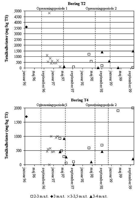 Analyseresultater for jordprøver udtaget fra hhv. boring T2 og T4 under oprensningen.