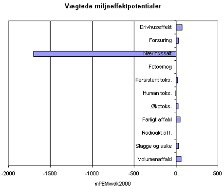 her! Som det fremgår af ovenstående figur er det mest markante bidrag relateret til drivhuseffekt og dernæst til forsuring, næringssaltbelastning samt økotoksicitet og persistent toksicitet. For disse effektpotentialer gælder, at bidraget hovedsageligt stammer fra tilvejebringelse af el bortset fra næringssaltbelastning. Der er betydelig usikkerhed ved næringssaltbidraget. For de øgede effektpotentialer for næringssaltsbelastning udgør knap 9 kg bidrag fra en noget usikker fastsættelse af størrelsen af N-udvaskning ved anvendelse af slammet på marker. For de sparede ressourcer udgør hovedparten bidrag fra fosforudledning ved produktion af fosfor-kunstgødning. Der er dels stor usikkerhed om denne udlednings størrelse, dels om hvor stor en mængde fosfor, der er er i slammet. Forøgelsen i næringssaltsbelastning er dog ubetydelig i sammenligning med besparelsen knyttet til udledningen til recipienten , jf. figur 9.11. Affald