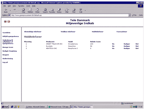4.2 Hvad er den elektroniske indkøbshåndbog?For at opfylde ovenstående formål, er den elektroniske indkøbshåndbog lavet som en centralt placeret multi-bruger web-applikation, som er tilgængelig via Internettet for både Tele Danmarks indkøbere og såkaldte Product Managers (PM'erne beslutter hvilke produkter, der skal indkøbes), samt for de nøglepersoner hos leverandørerne eller producenterne, som skal forestå besvarelsen af spørgeskemaet. Mange leverandører eller producenter findes udenfor Danmark, og indkøbshåndbogen er derfor lavet, så der kan vælges mellem en dansksproget og en engelsksproget brugerflade, men dog med en fælles lagring af besvarelser i begge sprog. Indkøbshåndbogen indeholder et udførligt uddannelsesmateriale (se kapitel 5), som er udformet både til brug som opslagsværk, og som et kursusmateriale til et introduktionskursus. Udover uddannelsesmaterialet, som er rettet mod forståelse af baggrunden for systemet, indeholder indkøbshåndbogen yderligere en vejledning til fyldelse af spørgeskemaet. Denne vejledning er primært rettet mod producenter og leverandører i forbindelse med besvarelse af spørgeskemaet, og findes på både dansk og engelsk. Indkomne spørgeskemaer lagres i en database, som er inddelt i fire segmenter, svarende til de fire produkttyper, som er dækket af systemet: Fastnettelefoner, mobiltelefoner, trådløse telefoner og telefax-maskiner. Besvarelsen af spørgeskemaet kan udføres via Internettet, idet producenten eller leverandøren kan klikke sig ind på en brugerflade hvor spørgeskemaet kan udfyldes. Herved opnås formentlig væsentlige besparelser af tid og penge, samtidig med at det bliver let og operationelt for producent eller leverandør at udfylde skemaet. Producentens og leverandørens adgang til systemet er styret af brugernavn og adgangskode. Det er naturligvis også muligt for indkøberen at printe og fremsende en papirversion af spørgeskemaet, således at besvarelsen sker manuelt. Dette vil dog udover papirarbejdet kræve at besvarelsen lagres manuelt i databasen. Produkter, for hvilke der findes besvarelser i databasen, miljøvurderes indbyrdes indenfor en specifik produkttype med den automatiske scorefunktion, som udfører scoring i henhold til scoresystemet, som blev beskrevet i kapitel 3. Det er muligt at ændre i scoresystemets vægtninger og prioriteringer, men dog ikke i dets opbygning, da denne jo svarer nøje til opbygningen af spørgeskemaet. Men det er altså muligt i fremtiden at indlægge anderledes prioriteringer af de enkelte delspørgsmål og de enkelte delskemaer. Resultatet af scoringen vises for indkøber og systemadministrator (hos Tele Danmark sandsynligvis en Product Manager), men ikke for producent eller leverandør. En ny scoring kan udføres for den pågældende produkttype hver gang et nyt produkts besvarelse lægges i databasen. Da systemet er en centralt placeret web-applikation, kan flere indkøbere og PM'ere arbejde med systemet samtidig. Dette har naturlige praktiske og organisatoriske fordele. 4.3 Den elektroniske indkøbshåndbogs skærmbilleder4.3.1 Login menuerSystemet har tre brugerniveauer: Man kan logge på som leverandør/producent, som indkøber og som systemadministrator. Login forgår vha. brugernavn og adgangskode, som tildeles af systemadministratoren. Login skærmbilledet findes på Internettet under den aktuelle Internet-adresse, som en ny brugervirksomhed kan vælge når den får systemet. Login skærmbilledet ser således ud: