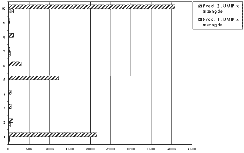 det enkelte stof multipliceret med mængden af stoffet. Figuren viser, at produkt 2 scorer