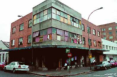 miljøets slumkvarter. Med farvestrålende plakater på væggene, vildtvoksende