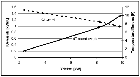 Som det ses, er temperaturdifferensen meget afhængig af ydelsen. Dette bliver endda forstærket ved, at vekslerens KA-værdi falder med stigende ydelse.