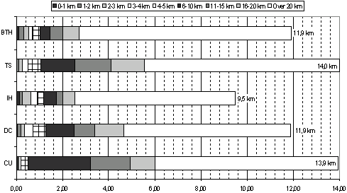 gennemsnitsafstande på hhv. 13,9 og 14,0 km mellem bopæl og virksomhed. Derefter kommer