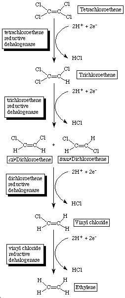 Anaerob, reduktiv nedbrydning af tetrachlorethylen (UMBBD, 2001)