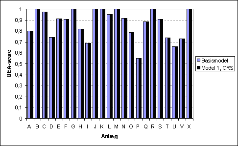 Note: Alle variable er årlige for 2000. Der er gennemført en input-orienteret DEA-analyse med disse variable. Resultatet under antagelse af konstant skalaafkast fremgår af figuren nedenfor.