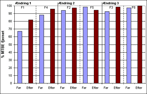 Figur 9.6: Figur 9.6 viser fjernelsen af MTBE før og efter returskyl efter en returskylsfrekvens på henholdsvis 7 og 10 dage. Efter både 7 og 10 dage sker der en effektiv fjernelse af MTBE (96-100%). Ved en returskylfrekvens på 7 dage sker der en mindre fjernelse af MTBE end ved en frekvens på 10 dage; forskellen er dog kun på nogle få procent. Ved 7 dages frekvens ses også en nedgang i fjernelsen af MTBE efter returskyl, som ligeledes er observeret og beskrevet tidligere i afsnit 9.1. Ved 10 dages frekvens fjernes der 100% MTBE både før og efter returskyl. Vandhøjden over filteret var noget højere ved en frekvens på 10 dage, frem for 7 dage. En endnu lavere frekvens end 10 dage er, med den nuværende filterkonstruktion, ikke mulig på grund af stigende vandhøjde ved faldende frekvens. Fjernelsesprocenten for MTBE er høj, og for at opnå mere sigende resultater er det nødvendigt at udfordre mikroorganismerne yderligere. Dette kunne evt. gøres ved at køre forsøget ved et højere flow eller ved en højere MTBE-koncentration. 9.4.3 KonklusionDet tyder på, at returskylfrekvensen har betydning for fjernelsen af MTBE, således at en lavere frekvens vil forbedre den biologiske nedbrydning af MTBE. Der er dog behov for et uddybende forsøg, hvor mikroorganismerne i filtrene bliver udsat for mere ekstreme forhold. 9.5 Sammenfattende konklusion for effekten at returskylstrategienDen samlede vurdering af returskyllets påvirkning af MTBE-nedbrydningen i filtrene på Grubbemølle Vandværk er som følger: Den nuværende returskylstrategi fungerer tilsyneladende optimalt med hensyn til udskylning af jern- og manganudfældninger. De påførte ændringer i returskylstrategien resulterer i en mindre udskylning af aktiv biomasse. En ændring af returskylstrategien er altså aktuel med henblik på at opnå en bedre MTBE-fjernelse, men det er nødvendigt at finde en strategi som samtidig opretholder filterets andre funktioner. Yderligere tyder de udførte analyser på, at en lavere frekvens mellem returskyllene er fordelagtig med hensyn til MTBE-nedbrydningen i filtrene.