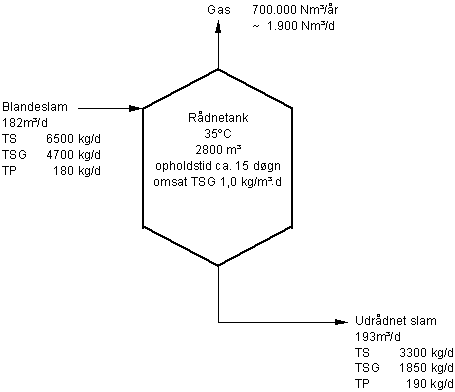 Figur 6.1 Stofbalancerne, der er vist i figur 6.1 og beskrevet nedenfor, er baseret på det samlede rådnetanksystem, som består af to tanke på hver 1.400 m3, hvoraf den ene er omrørt. Omsætning i rådnetanken Den årlige gasproduktion for rådnetankene var i 1998 ca. 700.000 Nm3 svarende til ca. 1.900 Nm3/d. Belastningen var i uge 15 ca. 1,7 kg TSG/(m3× d) svarende til at rådnetankene var middel til højt belastet. Opholdstiden var ca. 15 døgn. Anlæggets egne driftsmålinger viser en opholdstid på ca. 20 døgn. Ved mesofil udrådning (35° C) og under de givne betingelser kan der regnes med en gasproduktion på ca. 700 l/kg TSG. Omsætningen af TSG var ca. 2.850 kg/d svarende til en gasproduktion på ca. 2.000 Nm3/d. Der var således god overensstemmelse mellem den omsatte mængde TSG og middelgasproduktionen pr. døgn. Total-P Fosfor er et konservativt stof i forhold til omsætningen i rådnetanke, og derfor bør mængden af Total-P i tilløb og afløb fra rådnetanke være den samme under stabil drift. Forskellen mellem belastning målt i tilløb og afløb var ca. 5%, hvilket antyder, at der er balance mellem ind- og udgående strømme. Data for uge 15 viser således, hvordan omsætningen i middel kan forventes at være. Reduktionen i tørstofmængder i rådnetankene var i de to uger henholdsvis 49 og 52%, mens reduktionen i glødetabet var 60% i uge 15 (der blev ikke målt glødetab i uge 16). Relateret til rådnetankvolumenet svarede omsætningen i TSG til ca. 1 kg/(m3× d). Omsætning af NPEOn Data i tabel 6.8 viser en klar stigning i mængden af NP + NPEO1-2 fra tilløb til afløb af rådnetankene. Den udledte mængde af NP + NPEO1-2 var 2,3-2,6 gange større end den tilførte mængde. Reelt lå koncentrationen af NPEOn under detektionsgrænsen på 0,1 µg/l i det udrådnede slam. Ved beregningen af mængden af NPEOn i det udrådnede slam er anvendt den halve værdi af detektionsgrænsen. Ubalance for rådnetanken Umiddelbart kan forøgelsen af mængden af NP + NPEO1-2 i det udrådnede slam i forhold til mængden i blandeslammet ikke forklares ud fra, at NPEOn er blevet nedbrudt til NP + NPEO1-2 i rådnetanke. Følgende forhold kan kun delvist forklare, at mængden af NP + NPEO1-n ud af rådnetanken er større end ind i rådnetanken.