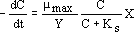 Hvor X er bakteriekoncentrationen, C er substratkoncentrationen, t er tiden, m max er observeret maksimal væksthastighed, Ks