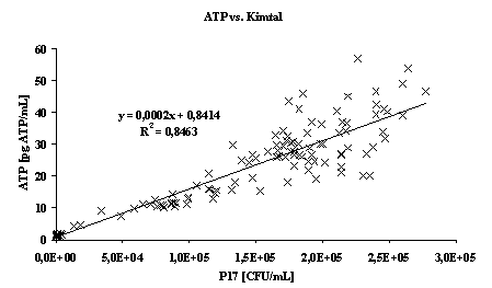 ved at sammenligne CFU P17-værdier med sammenhørende ATP-værdier. Hvis ATP-værdien er