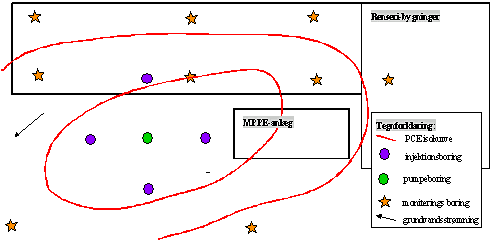 centrale injektionsboringer og 6 pumpeboringer i yderkanten af kildeområdet. Formålet