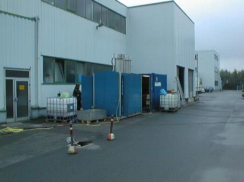 tensid-blanding. Den forreste blå container indeholder MPPE-behandlingsanlæget med to