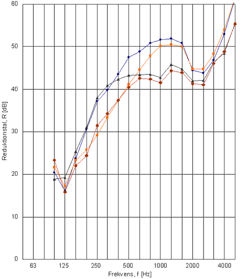 lydisolationsværdier Rw mellem 39 dB og 47 dB.
