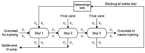 Et 3-trinsskyl med genanvendelse af sidste skyl som skyllevand i første skyl er