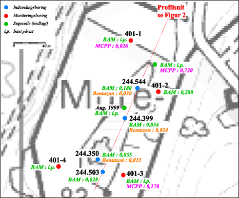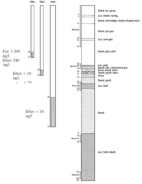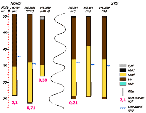 boringen ingen påviselig lerforsegling. Boringens BAM-indhold var 14 ng/l (1998). Et