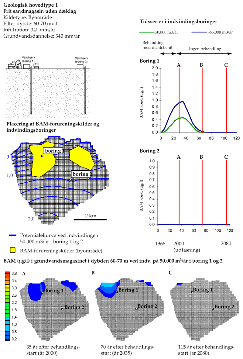 Modelberegnede BAM koncentrationer i dybe vandindvindingsboringer og omkringliggende