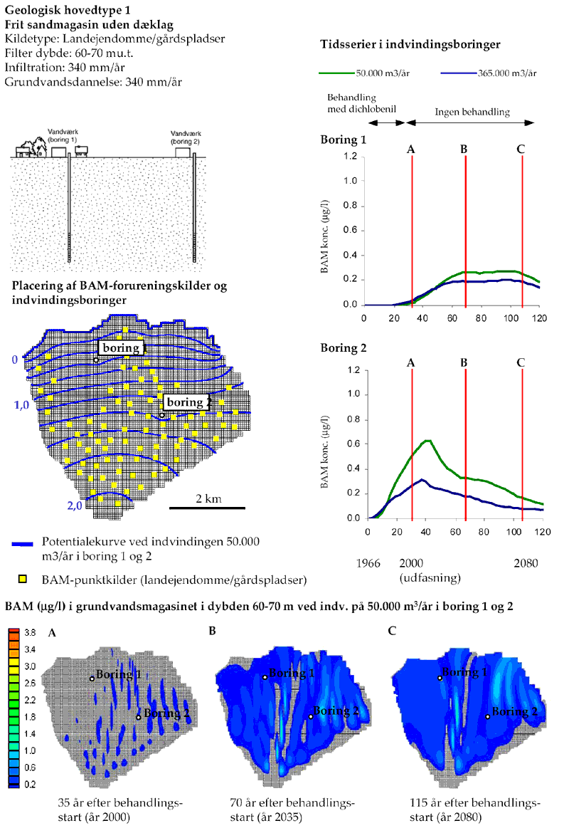 Modelberegnede BAM koncentrationer i dybe vandindvindingsboringer og omkringliggende