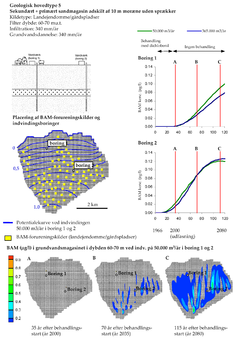 Modelberegnede BAM koncentrationer i vandindvindingsboringer og omkringliggende