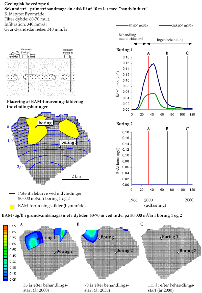 Modelberegnede BAM koncentrationer i vandindvindingsboringer og omkringliggende