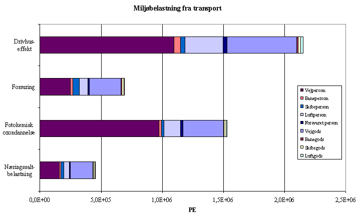 Figur 6.7 Miljøeffekter fra de enkelte person- og godstransportformer indregnet produktion af brændsler, 1998.